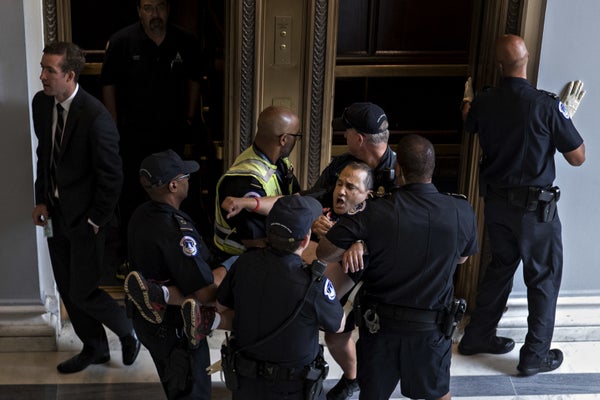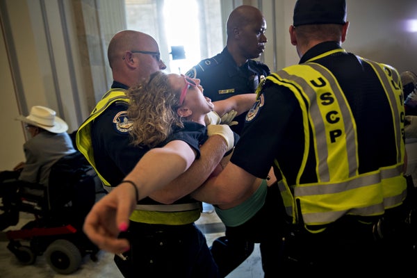 SAUL LOEB via Getty ImagesUS Capitol Police arrest a protestor against the Senate Republican’s draft healthcare bill outside the office of Senate Majority Leader Mitch McConnell (R-Ky.) on Thursday. -