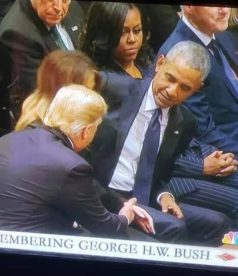 President Donald Trump and first lady Melania Trump greet former President Barack Obama and Michelle Obama as they join other former presidents and vice presidents and their spouses for the state funeral for former President George H.W. Bush at the National Cathedral, December 5, in Washington, D.C. The reunion made for some awkward moments.CHIP SOMODEVILLA/GETTY IMAGES