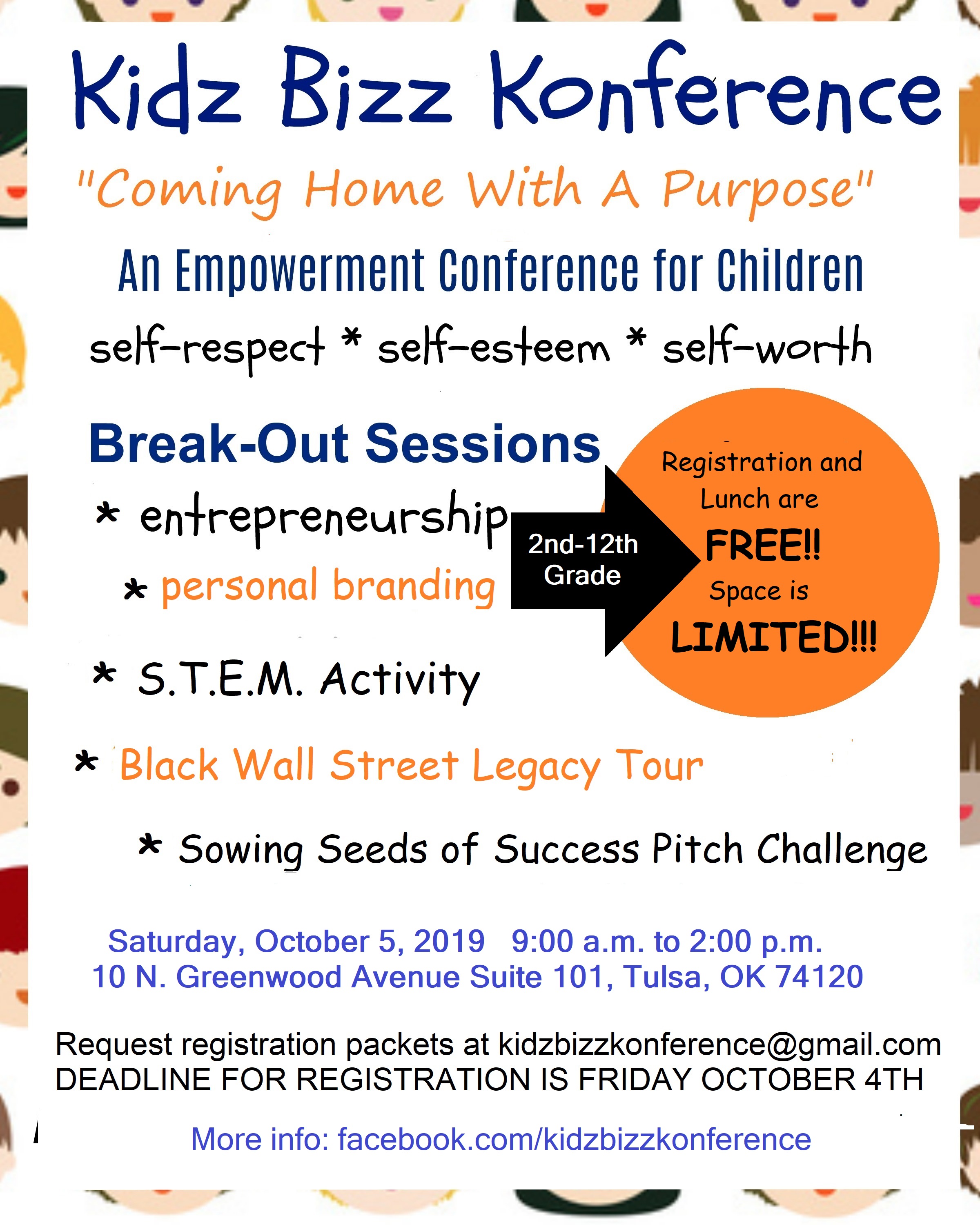 The event is scheduled for Saturday October 5, 2019 from 9AM-2PM. All activity will take place on the Historic Black Wall Street at 10 N. Greenwood. All registration fees were sponsored by community contributors, making this a no-cost event for families. If your child (2nd-12th grade) has not registered for KIDZ BIZZ Konference, you may request a registration form at kidzbizzkonference@gmail.com