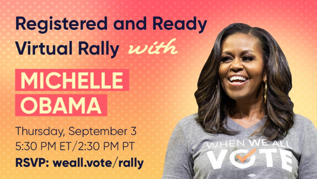 On Thursday, September 3 at 5:30 p.m. ET, When We All Vote Co-Chair Michelle Obama will host “Registered and Ready,” a virtual rally to engage and inspire eligible voters and volunteers to mobilize their communities now and during When We All Vote’s Week of Action, September 20th to 27th.