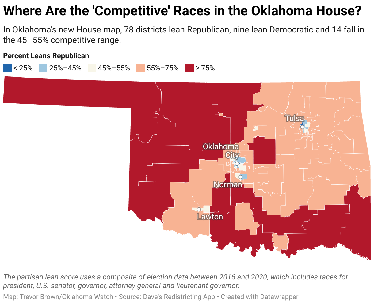 As expected the state legislature was forced to take up the issue last November. Unfortunately, although anticipated, House Bill 1002 was passed by the 58th Oklahoma Legislator and signed by Governor Stitt. In the 101-member House, 78 will now lean Republican, nine will lean Democratic and 14 fall in the 45–55% competitive range in the House.
