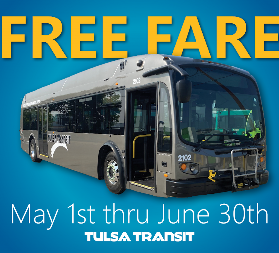 Rides on all regular Tulsa transit buses will be free from May 1 to June 30.