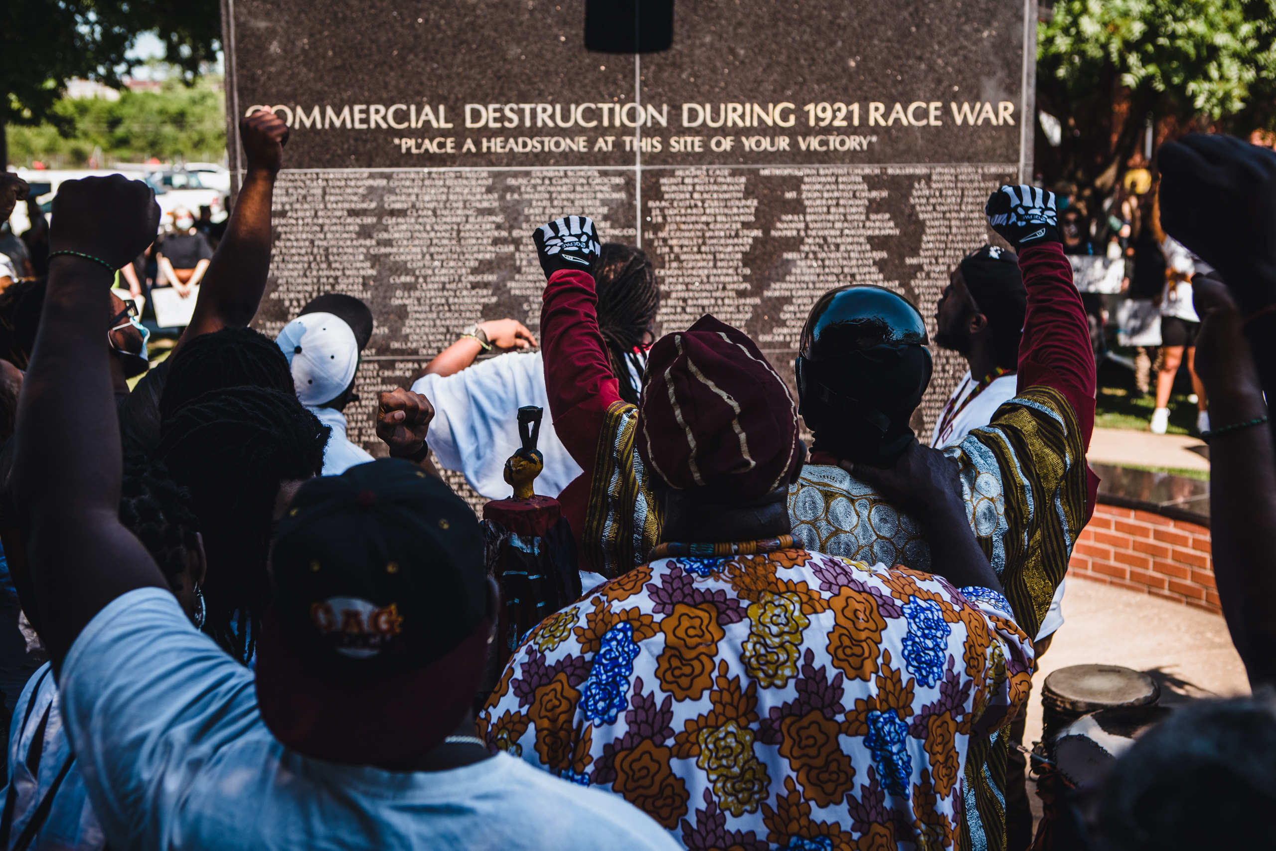 Performers and marchers stand in front of the Black Wall Street Memorial’s Pioneers Garden dedicated to the African American Tulsans who were murdered and businesses destroyed during the 1921 race massacre.
