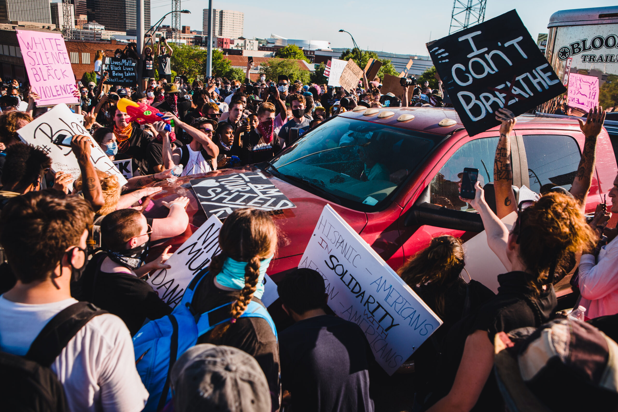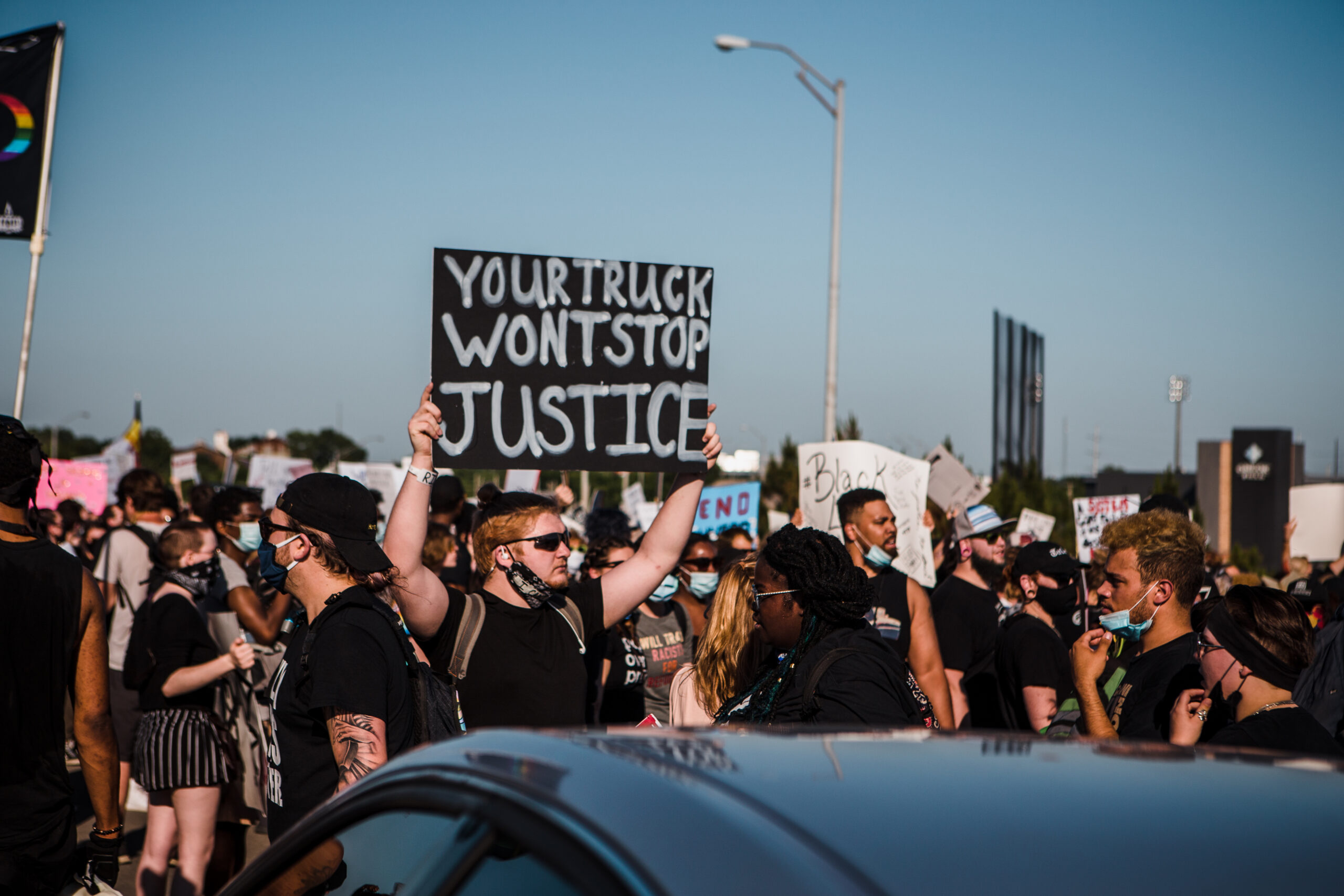 About 1,000 demonstrators protested on Interstate 244 just minutes after a pickup truck, with a livestock trailer in tow, drove his vehicle into the crowd. The act prompted one demonstrator to write this sign on the spot.