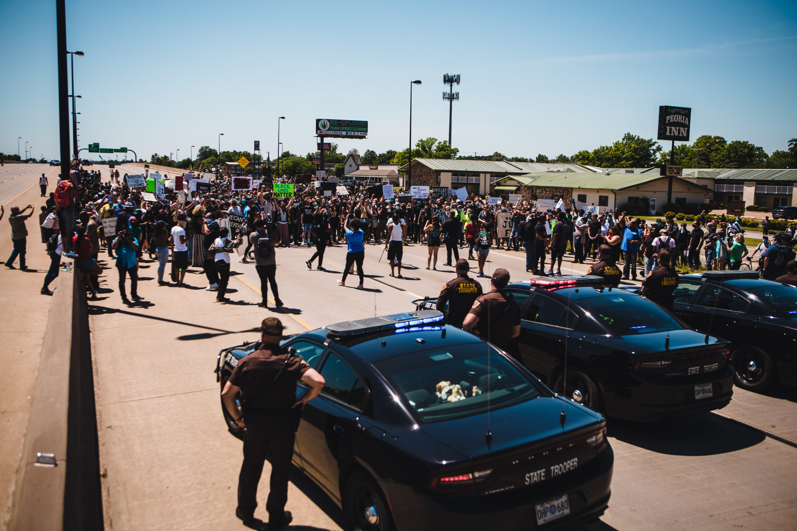 Oklahoma Highway Patrol troopers block westbound Interstate 44 as “We Can’t Breathe” protesters march against police brutality leading to deaths of George Floyd in Minneapolis on Memorial Day and numerous other black Americans.