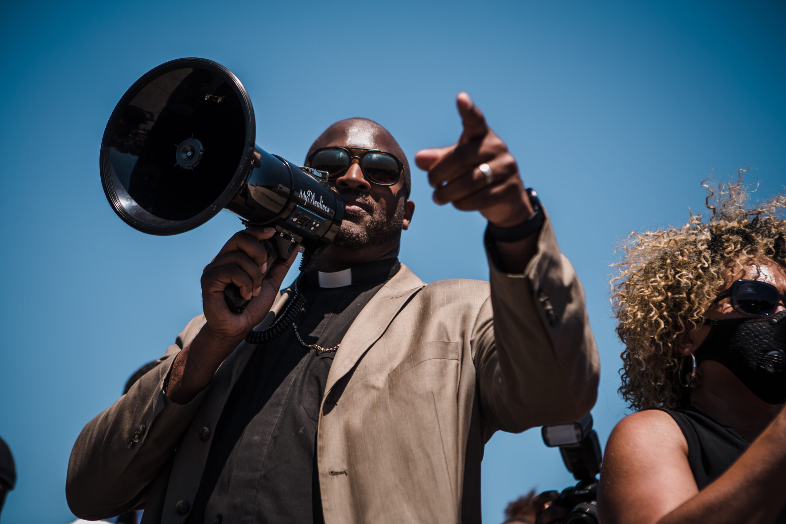 The Rev. Dr. Robert Turner, of Vernon AME Church, speaks at a rally as protesters walk through the Brookside District.