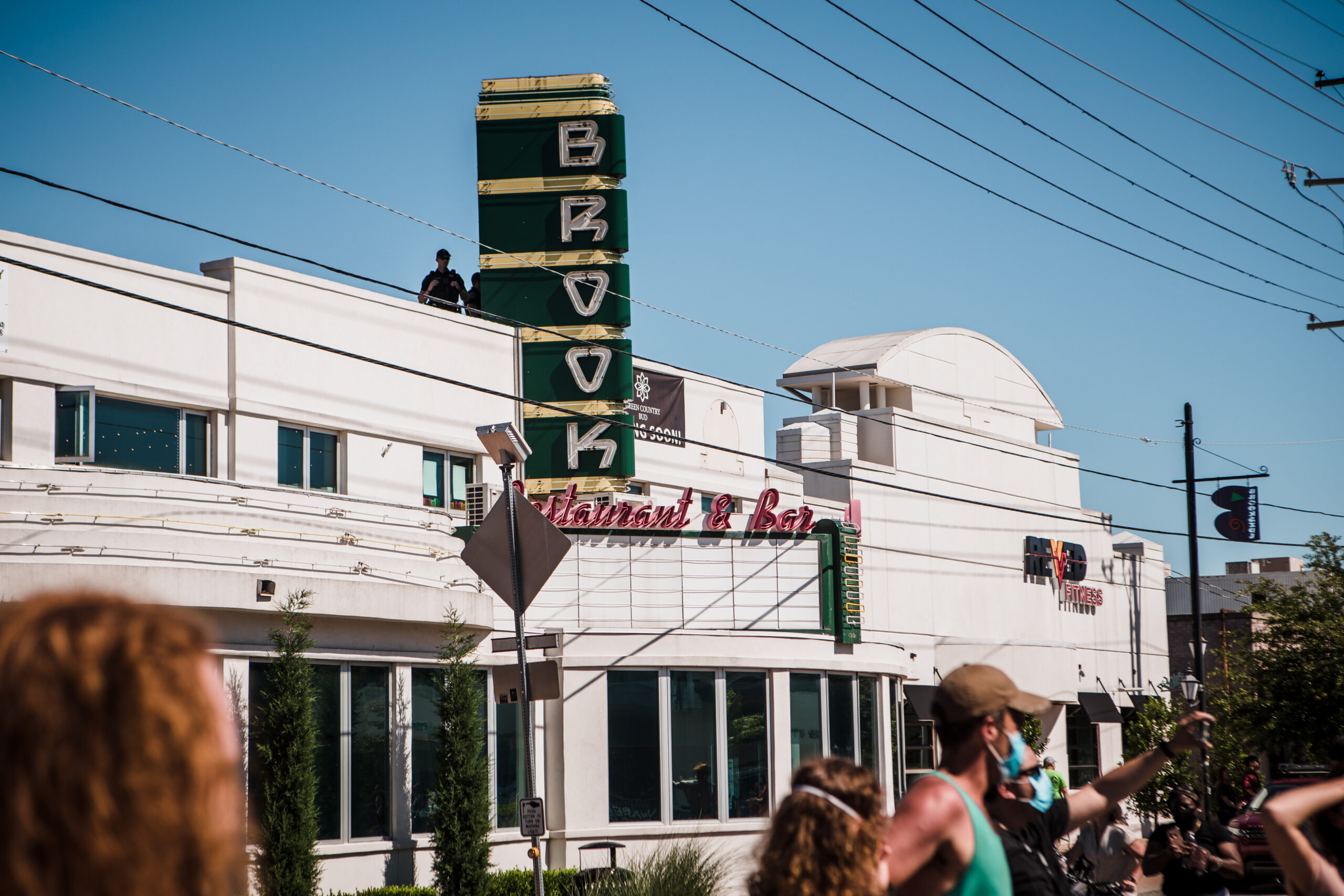 Tulsa Police Department atop Brook Restaurant & Bar in the Brookside District, as marchers makes their way back to 36th Street and Peoria Avenue.