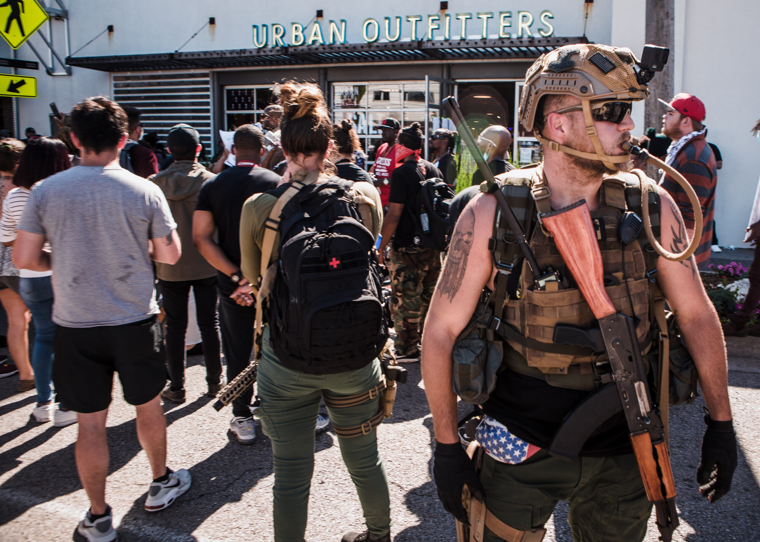 Self-identified members of “Sons of Liberty” join march in the Brookside District.
